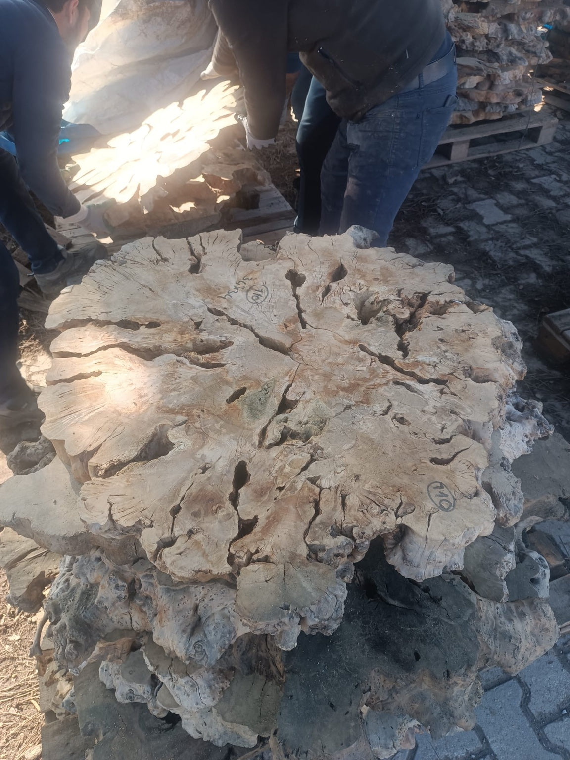 Massive Stammstücke werden nach Struktur und Maserung ausgewählt.