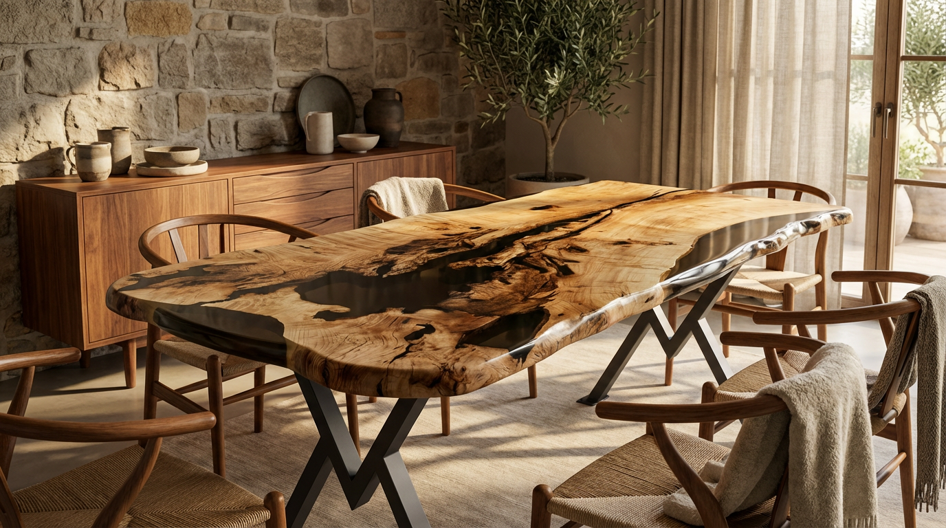 Dieser großformatige Massivholztisch aus Esche ist ein echtes Statement-Piece für großzügige Räume. Die lebendige Holzstruktur und das prägende Epoxidharz erzeugen eine außergewöhnliche Tiefe und Wirkung. Ein handgefertigtes Einzelstück mit repräsentativem Charakter.