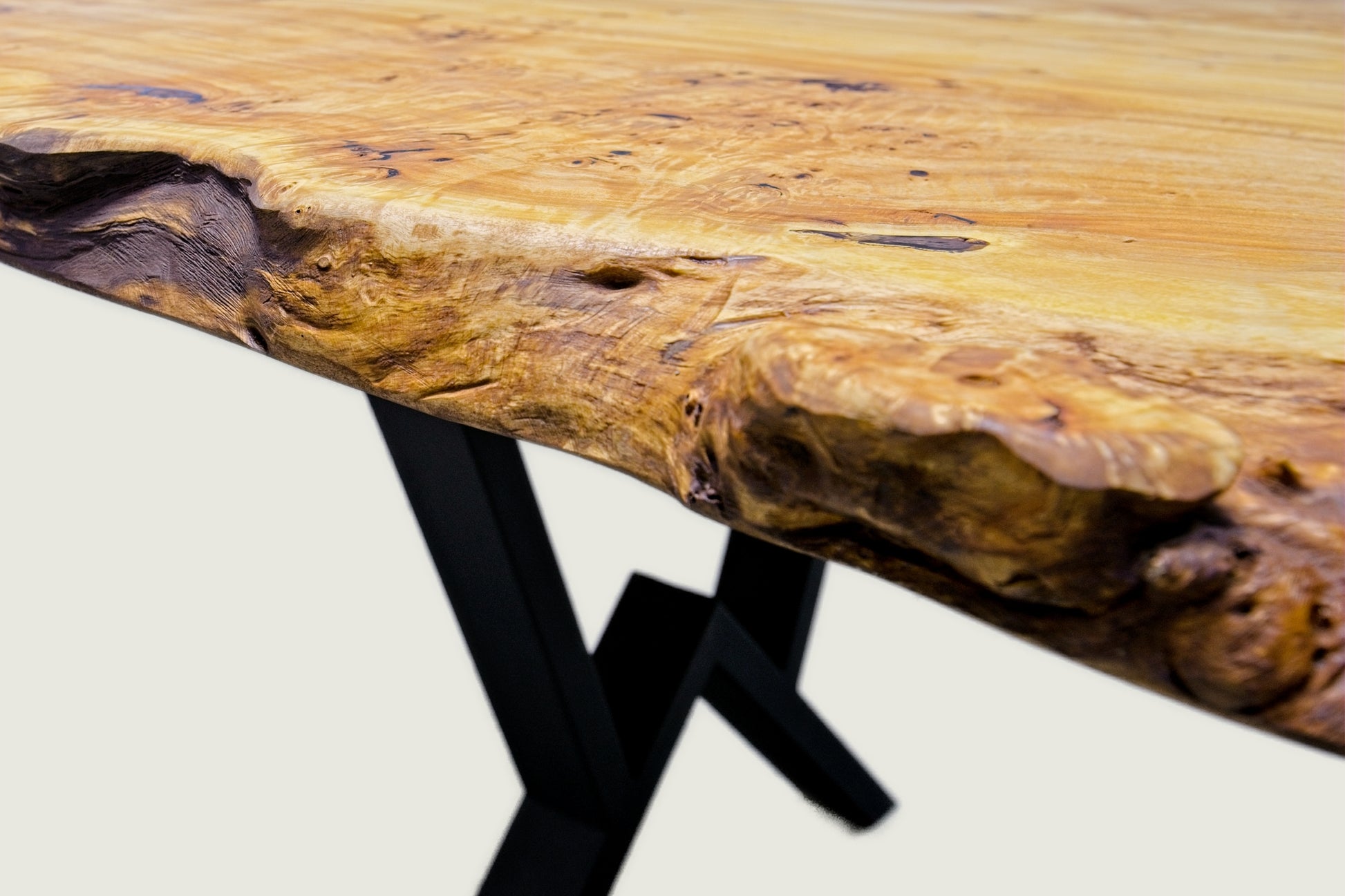 Dieser Massivholztisch aus Poplar Burl ist ein echtes Statement-Piece. Die lebhafte Maserung, organische Baumkante und natürliche Unregelmäßigkeit verleihen ihm einen unverwechselbaren Charakter. Ein handgefertigtes Einzelstück für Räume mit Anspruch.